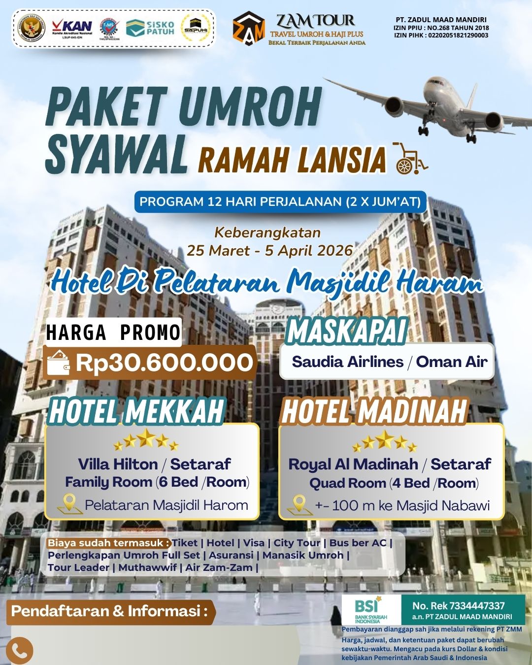 Wujudkan impian beribadah ke Tanah Suci dengan program Umroh Syawal Ramah Lansia. Dirancang khusus untuk kenyamanan jamaah, dengan hotel dekat masjid dan pendampingan profesional. ✨ Nyaman • Tenang • Ibadah Lebih Khusyuk ✨